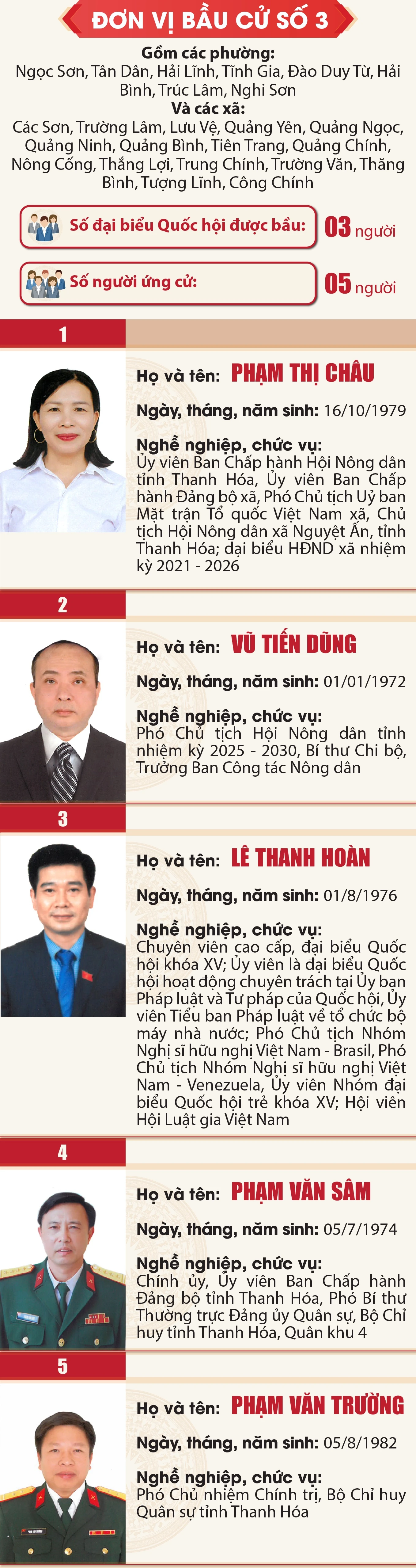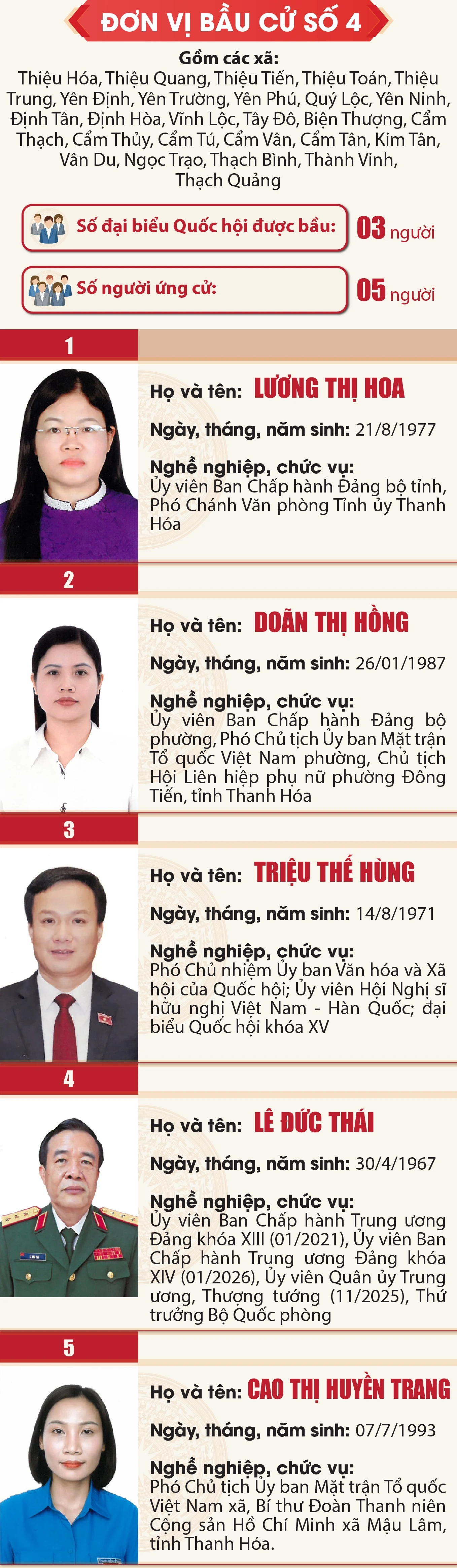 Thay mặt Hội đồng Bầu cử Quốc gia, Chủ tịch Quốc hội Trần Thanh Mẫn đã ký ban hành Nghị quyết số 151/NQ-HĐBCQG, ngày 14/2/2026 công bố danh sách chính thức những người ứng cử đại biểu Quốc hội Việt Nam khóa XVI. Sau đây là Danh sách người ứng cử đại biểu Quốc hội khóa XIV tại Thanh Hóa.